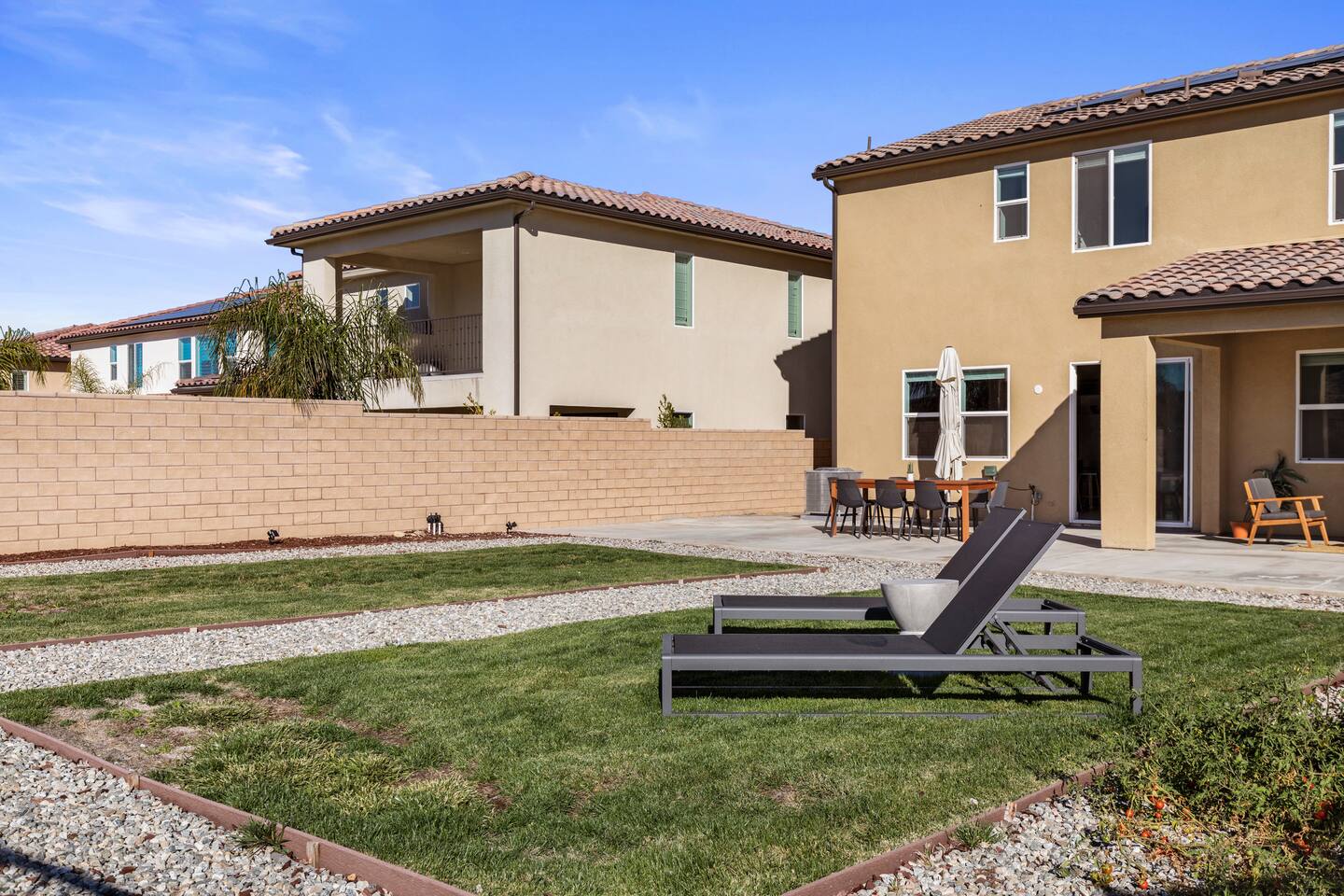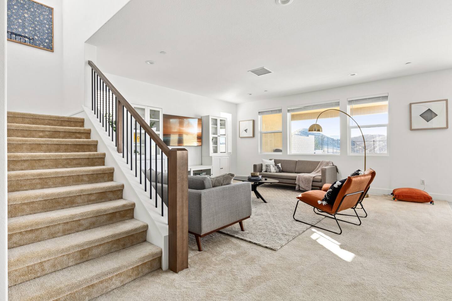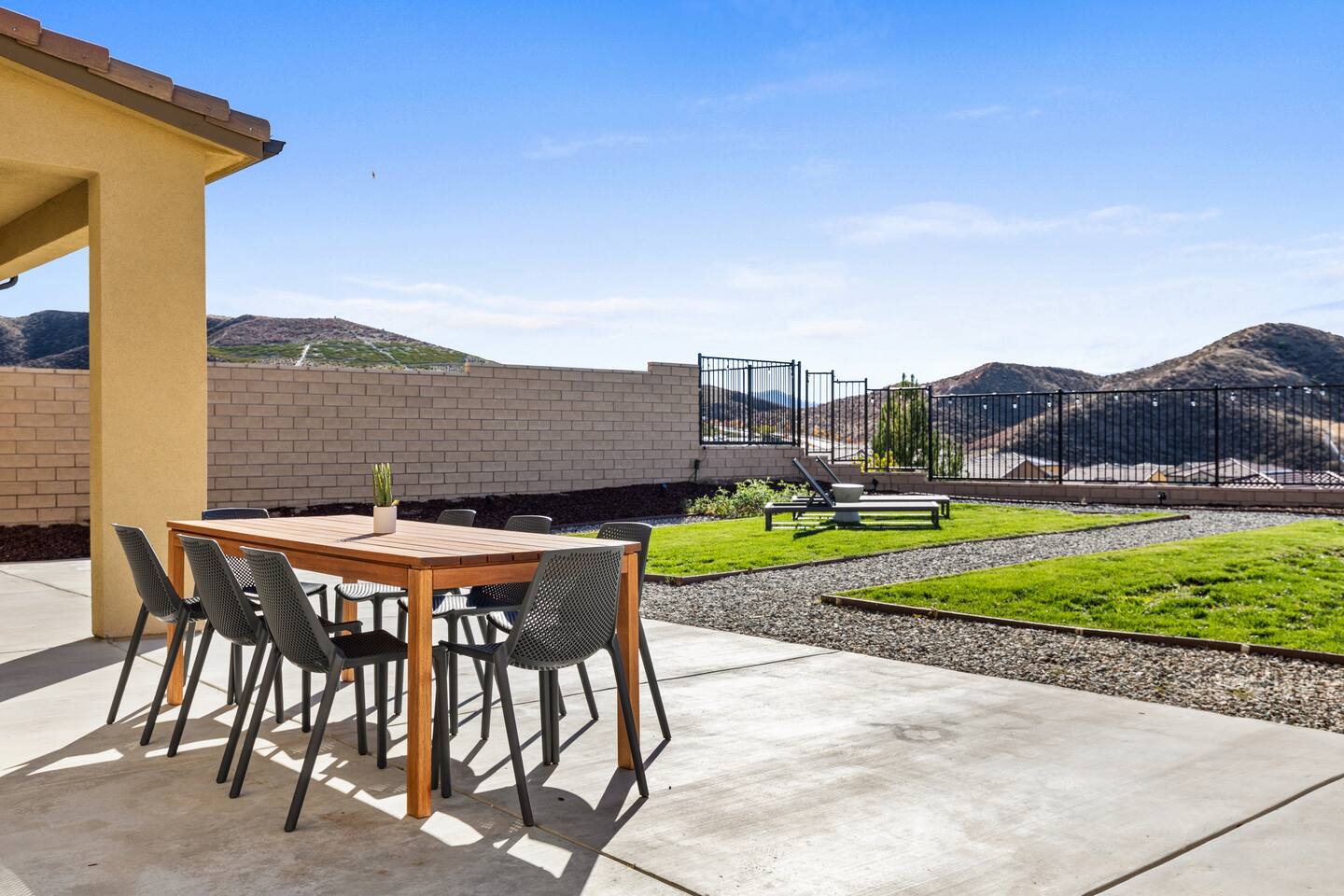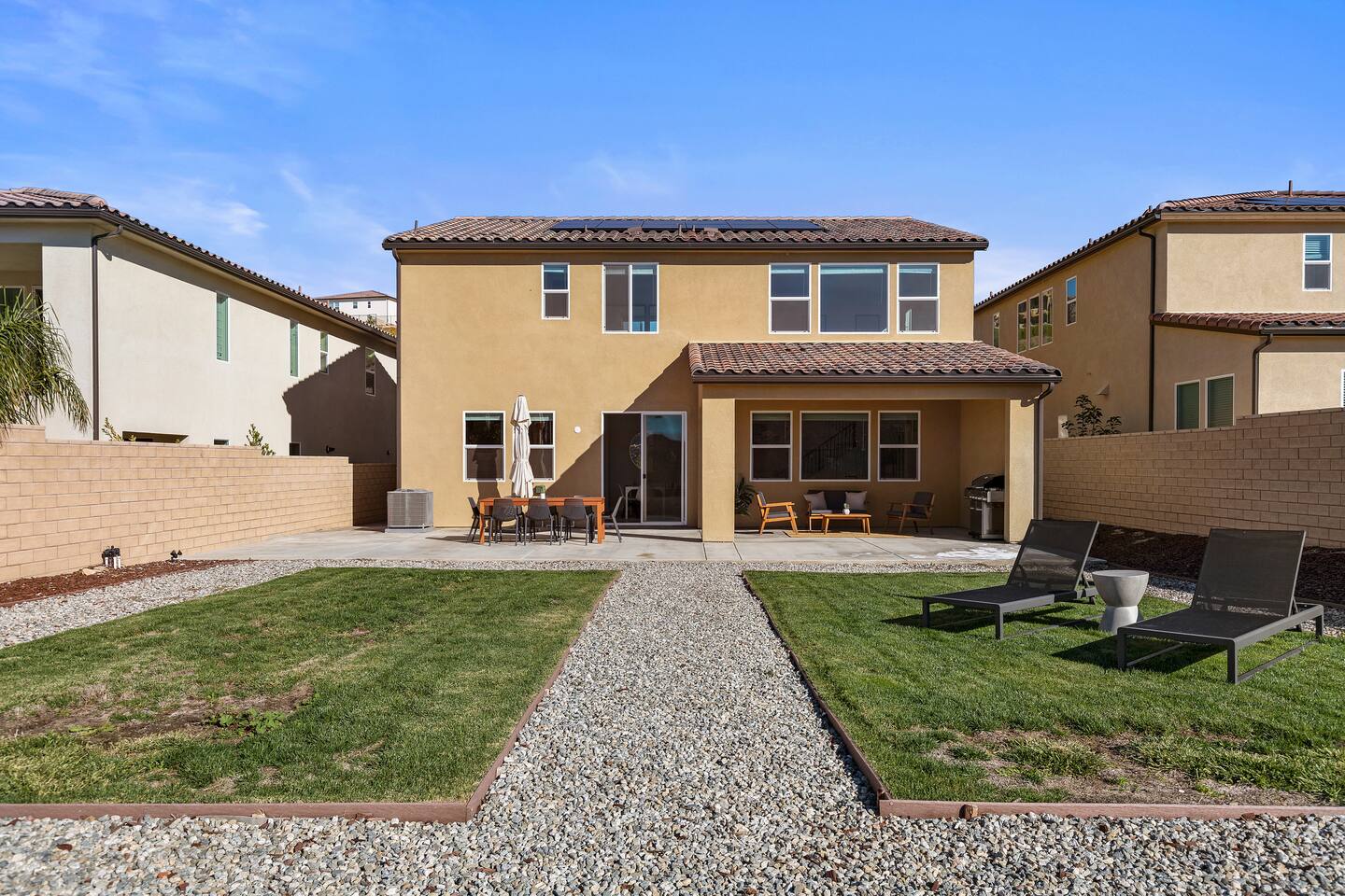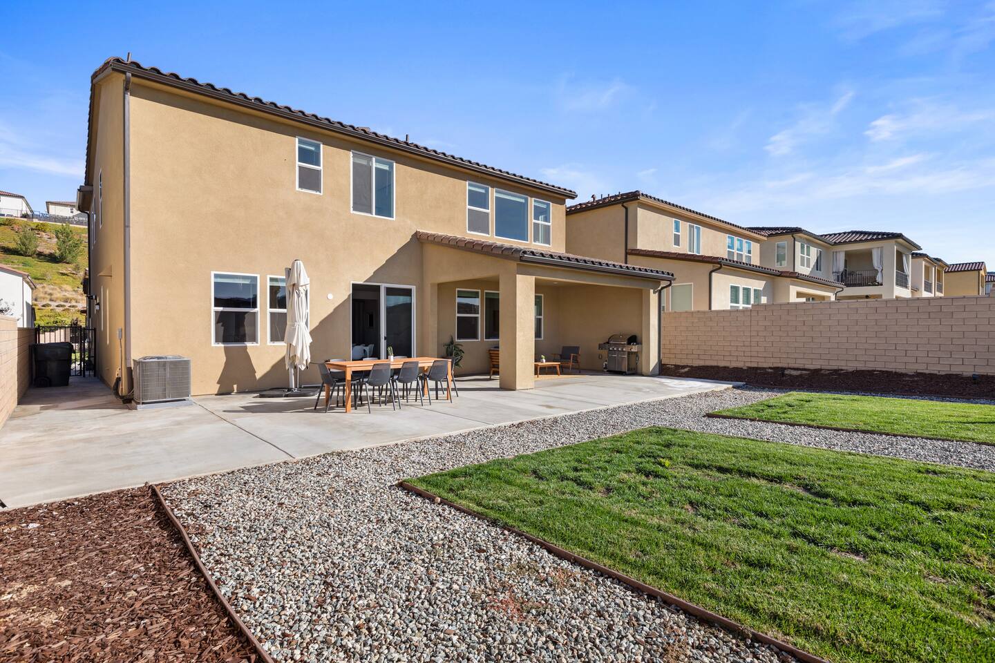 The luxury modern home features a large formal living room, a large dining room with buffet, which is connected to the kitchen via open floor plan. Furthermore, the home boasts a huge and welcoming entryway with a large staircase. The home offers a home office/ 5th bedroom and full bath downstairs and four more bedrooms and two bathrooms upstairs. The master bedroom has an en-suite bathroom with double vanity overlooking the resort-like backyard with lounge chairs & umbrella and mountain-views. The other three upstairs bedrooms share a full bathroom with double vanity and bathtub. Upstairs includes a large open lounge with a sofa bed and TV. The backyard provides a private Mountain View with two lounge chairs, a sun umbrella and a coffee table, outdoor dining, outdoor lounge, professional BBQ and plenty of space to relax.