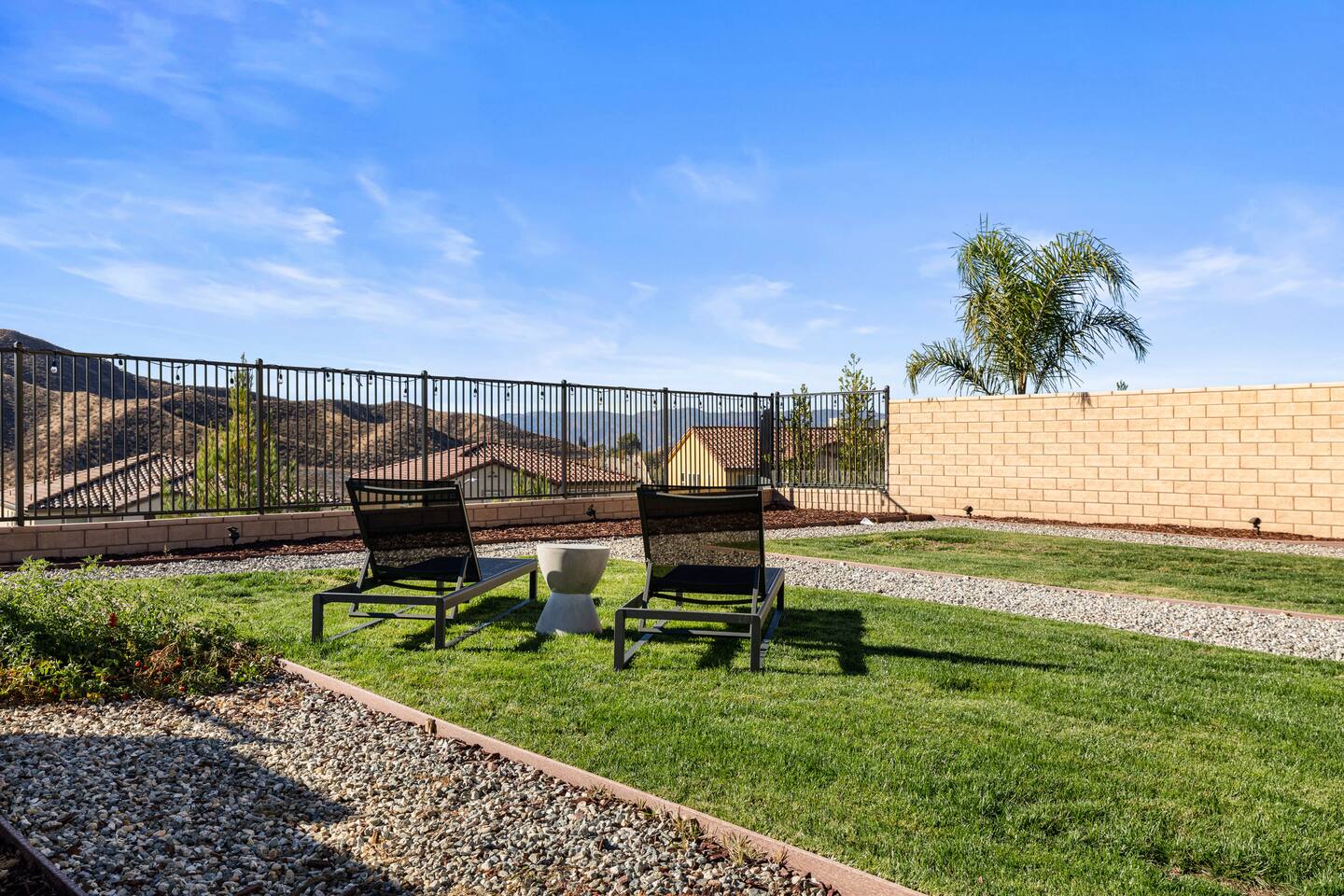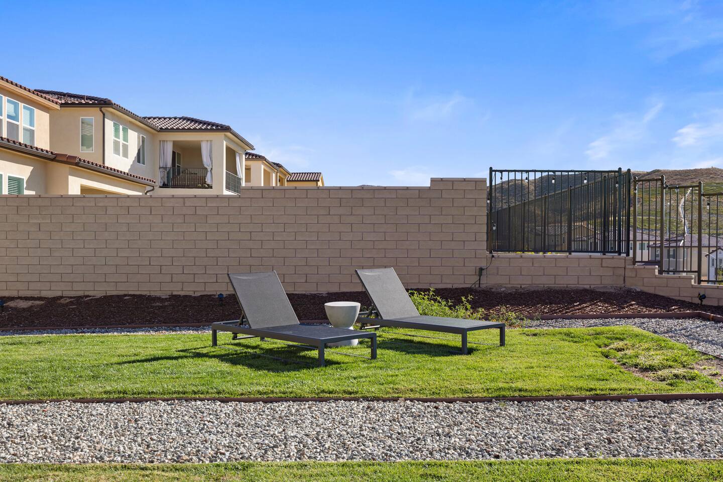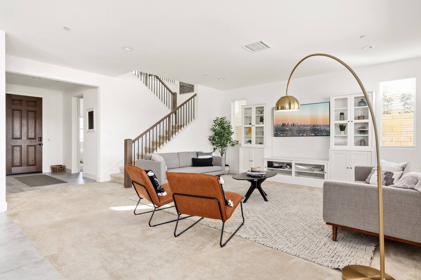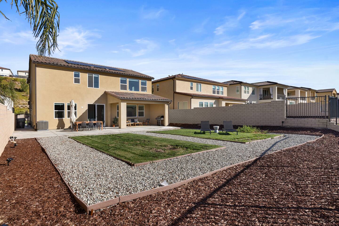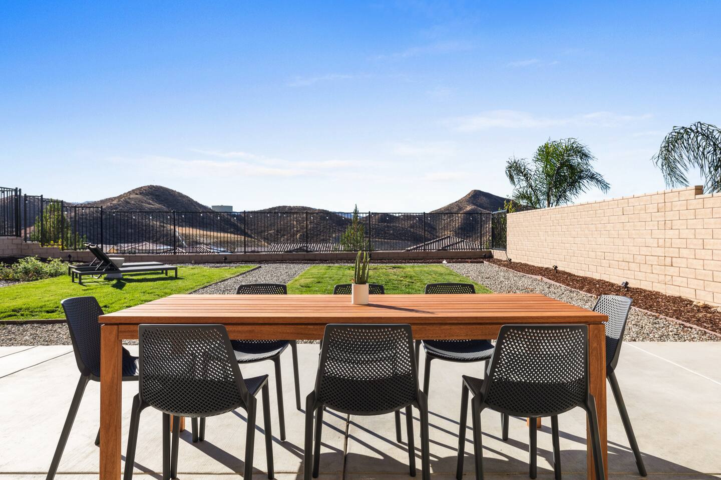 The luxury modern home features a large formal living room, a large dining room with buffet, which is connected to the kitchen via open floor plan. Furthermore, the home boasts a huge and welcoming entryway with a large staircase. The home offers a home office/ 5th bedroom and full bath downstairs and four more bedrooms and two bathrooms upstairs. The master bedroom has an en-suite bathroom with double vanity overlooking the resort-like backyard with lounge chairs & umbrella and mountain-views. The other three upstairs bedrooms share a full bathroom with double vanity and bathtub. Upstairs includes a large open lounge with a sofa bed and TV. The backyard provides a private Mountain View with two lounge chairs, a sun umbrella and a coffee table, outdoor dining, outdoor lounge, professional BBQ and plenty of space to relax.